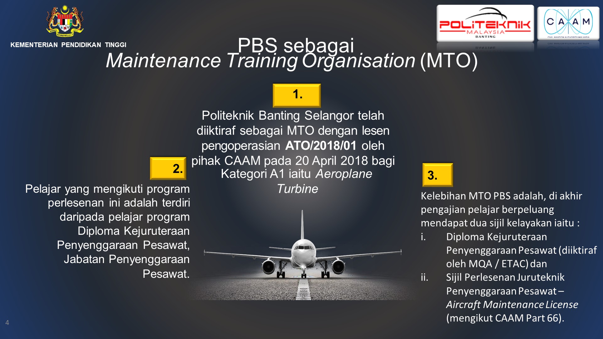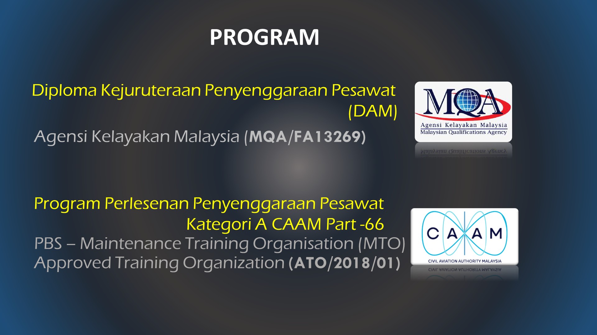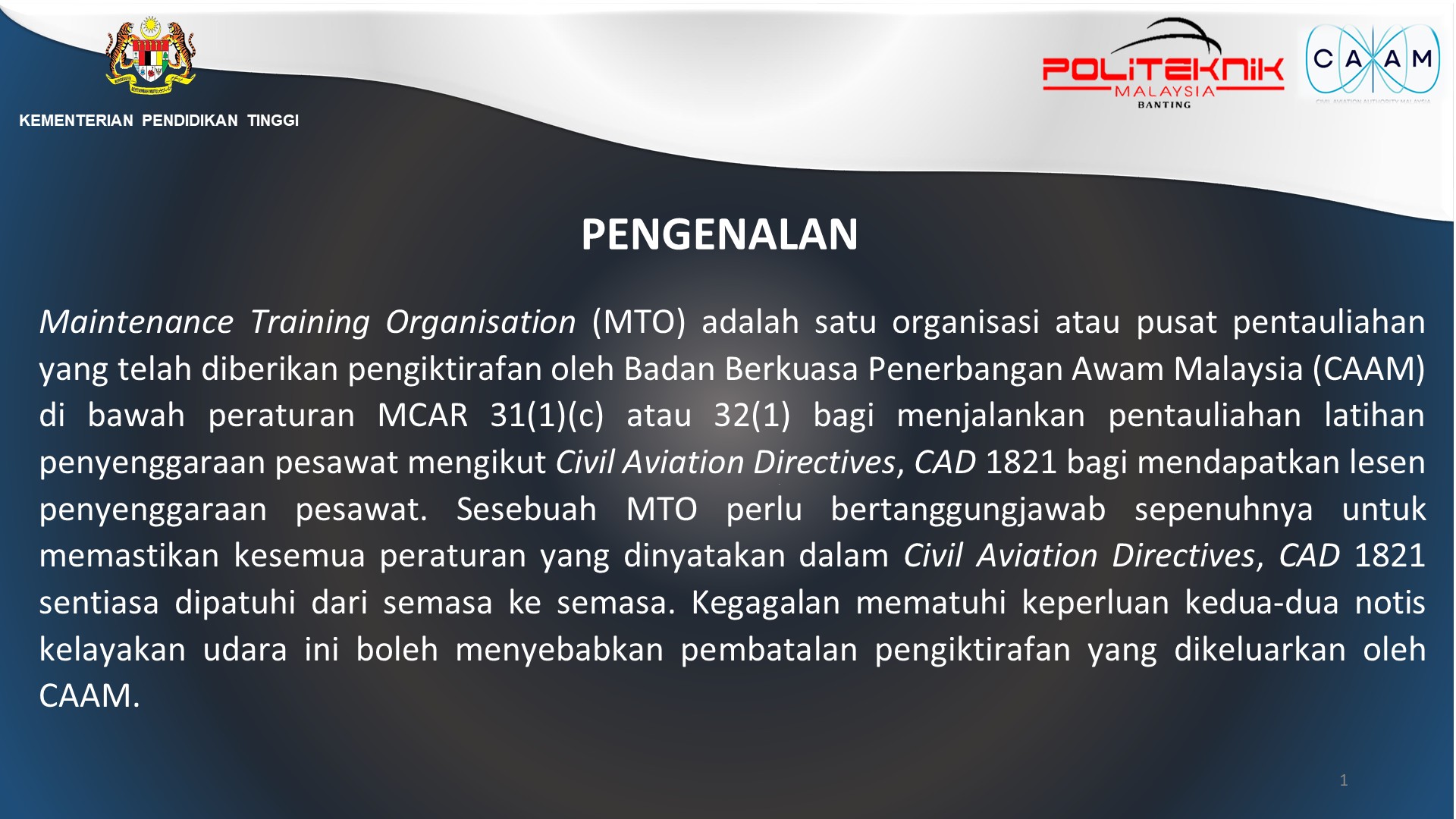 Organisasi yang bertanggungjawab untuk menyediakan latihan penyelenggaraan pesawat yang diiktiraf oleh Pihak Berkuasa Penerbangan Awam Malaysia (CAAM) mengikut Civil Aviation Directive (CAD) 1821 CAAM Part 147 di bawah Malaysian Civil Aviation Act (MCAR) 2016 – Regulation(s) 31, 32, 189 and 193.