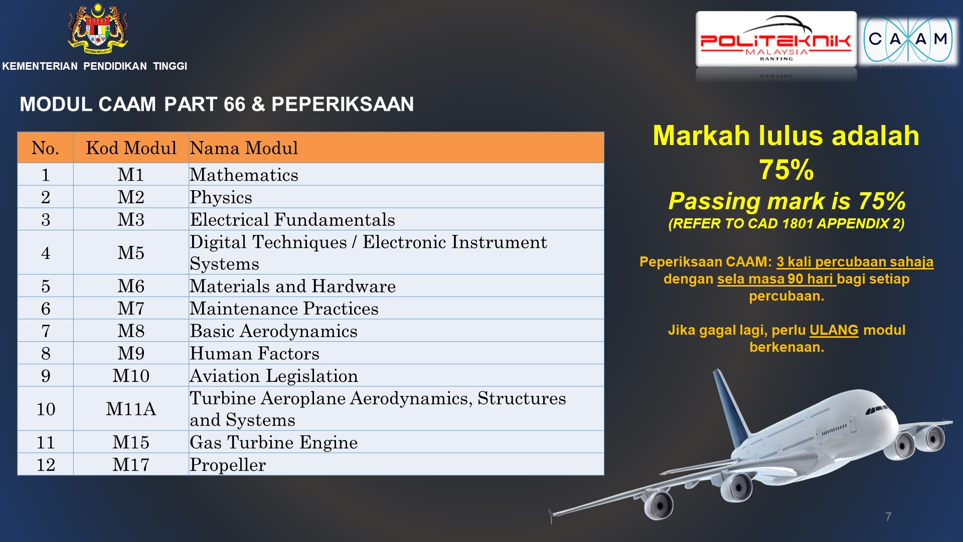 - Telah lulus kesemua 12 modul CAAM Part 66 di PBS