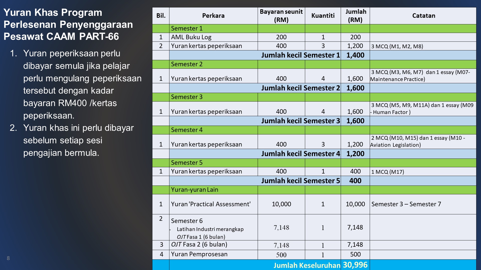 Sila rujuk jadual Yuran Khas Bagi Program Aircraft Maintenance Licence (CAAM Part 66)